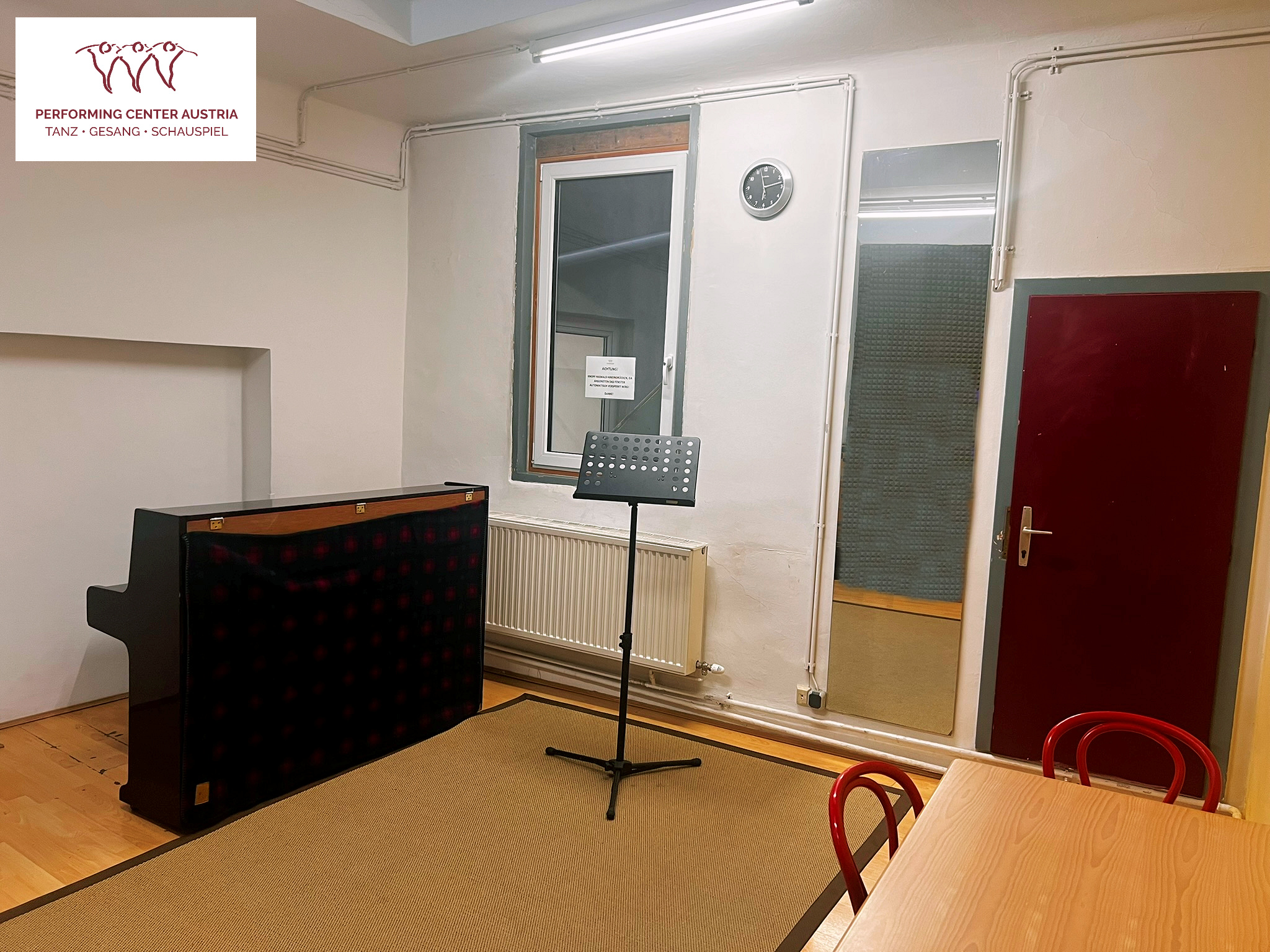 Mit 20 m² ist Gesangsstudio B etwas kleiner als Studio A, zählt aber zu den beliebtesten Gesangsstudios im Performing Center Austria. Der Raum überzeugt durch sein enorm helles Licht, das sowohl durch ein Fenster als auch durch das Oberlicht einfällt, und schafft so eine besonders inspirierende Arbeitsatmosphäre. Die Lage zum ruhigen Innenhof macht dieses Studio zu einem idealen Rückzugsort für konzentriertes Arbeiten.